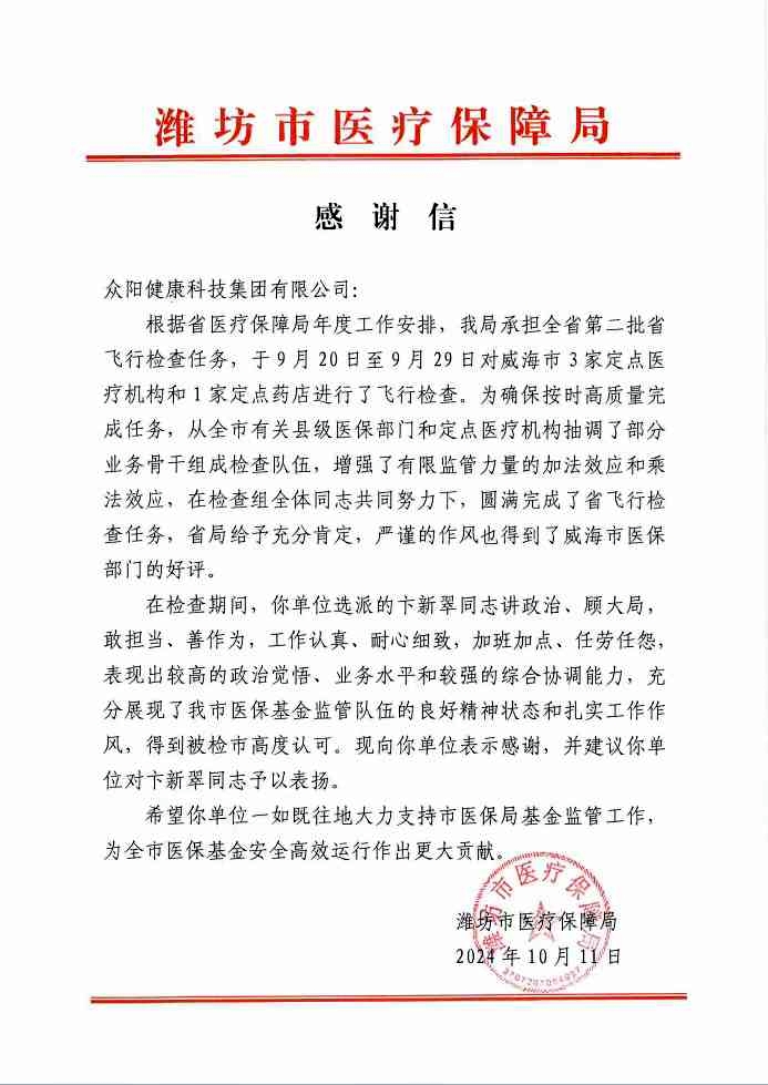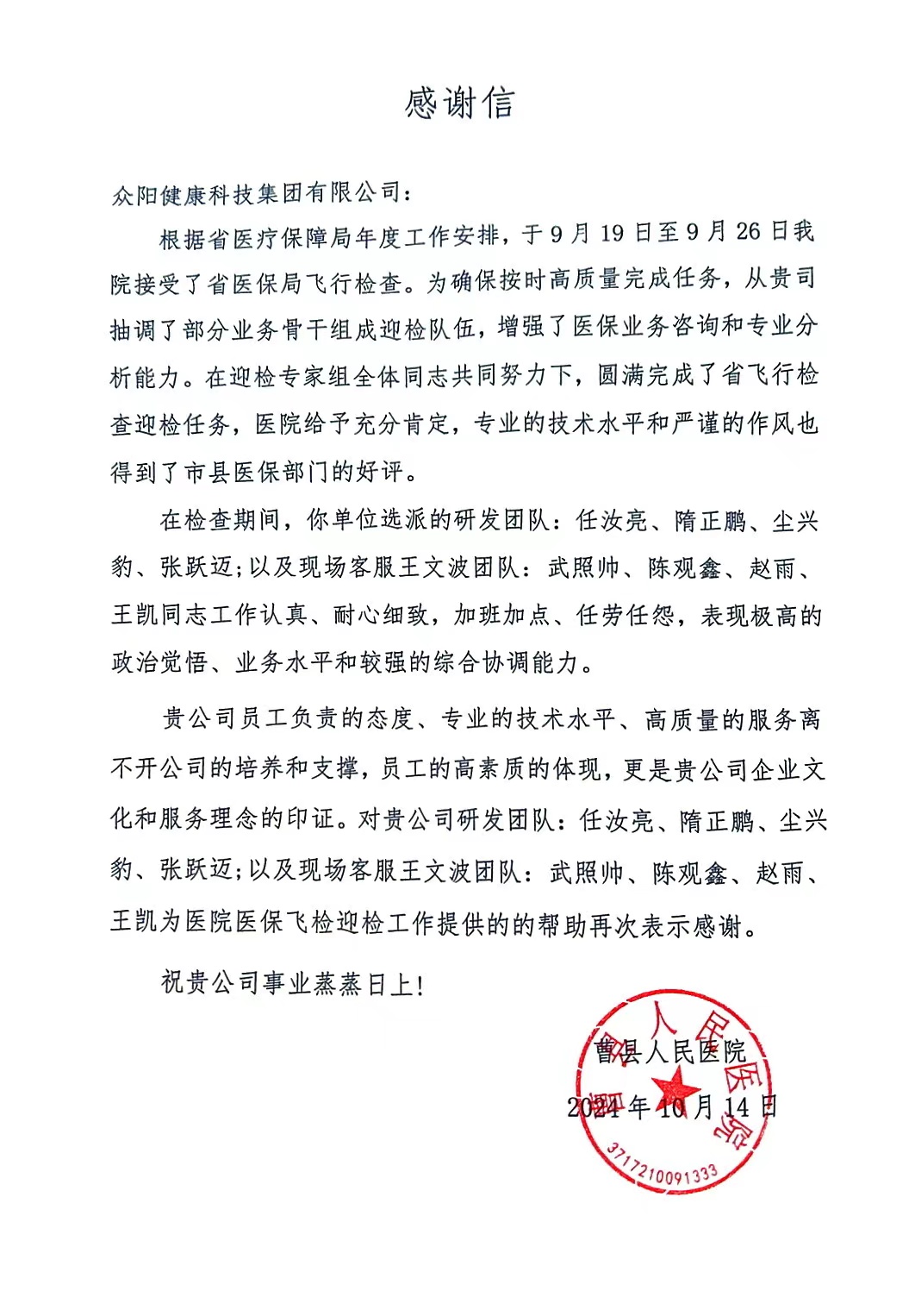 近日,众阳健康接连收到了潍坊市医疗保障局及曹县人民医院的感谢信。两封信中均对众阳健康在医保飞检行动中的鼎力支持表达了深切的谢意。