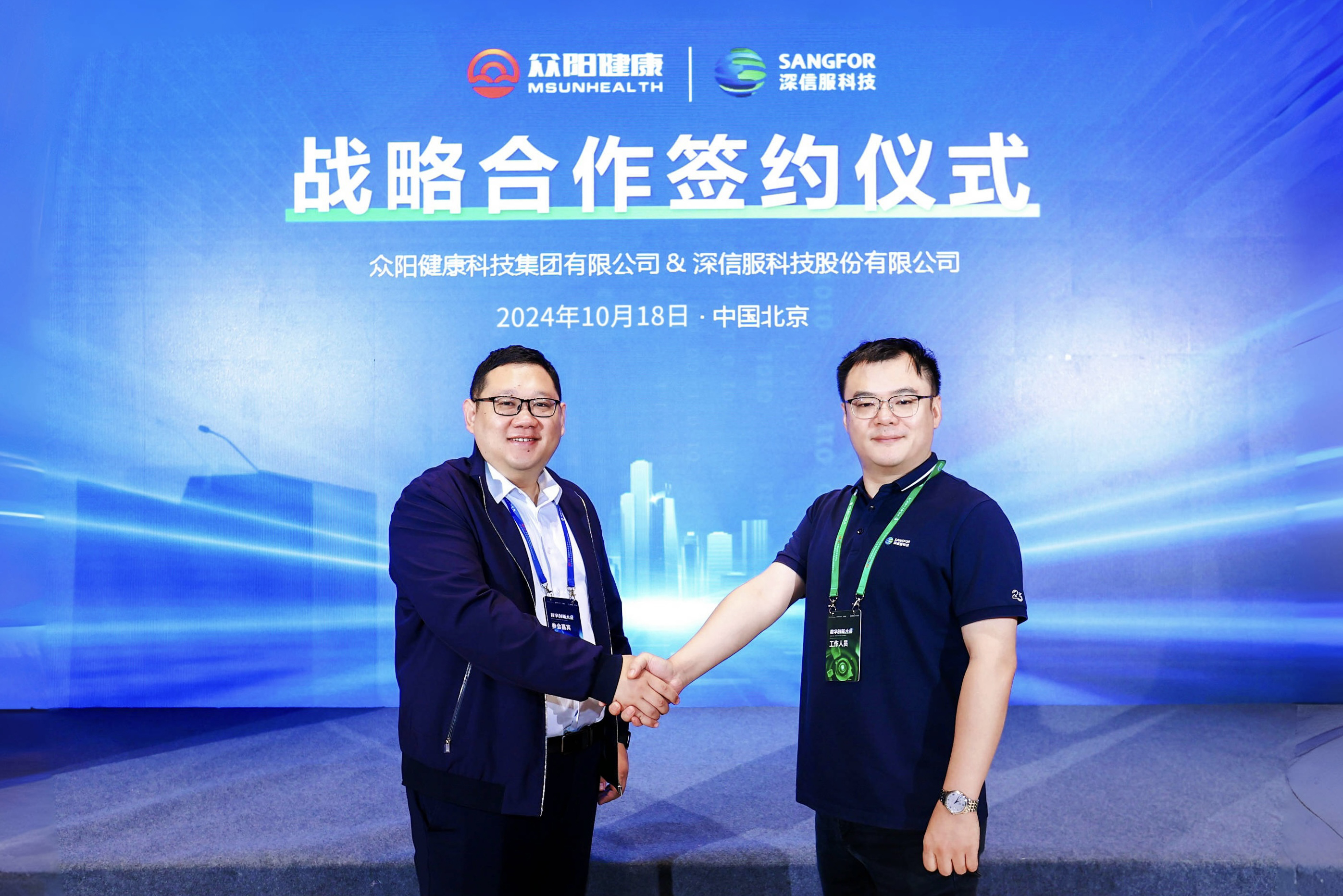 2024年10月18日,众阳健康与深信服科技股份有限公司(以下简称“深信服”)在北京签订战略合作协议,双方将充分整合各自优势、强强联合,携手为医疗健康领域数字化转型注入强劲动力。