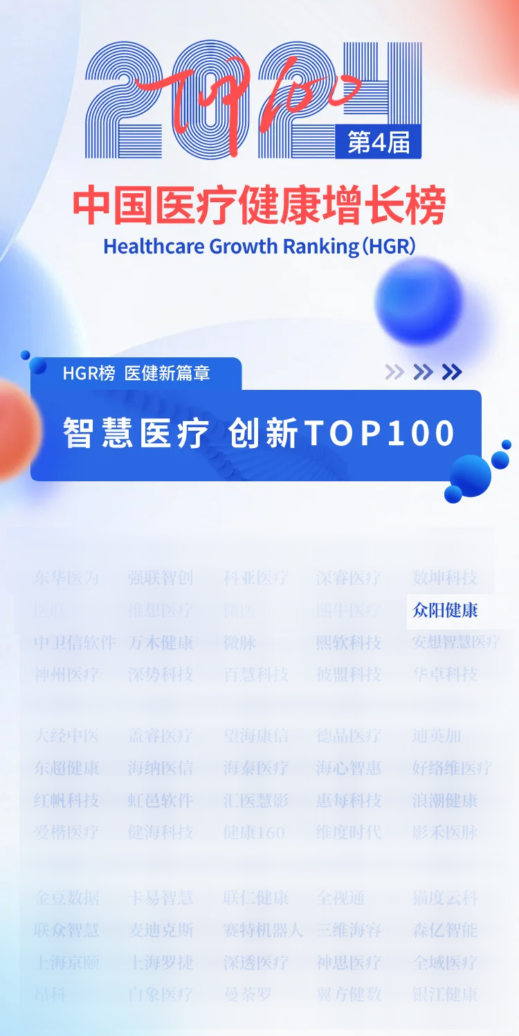 2024中国医疗健康增长Healthcare Growth Ranking(HGR)榜单发布,众阳健康入选“智慧医疗创新 TOP 100” 。
