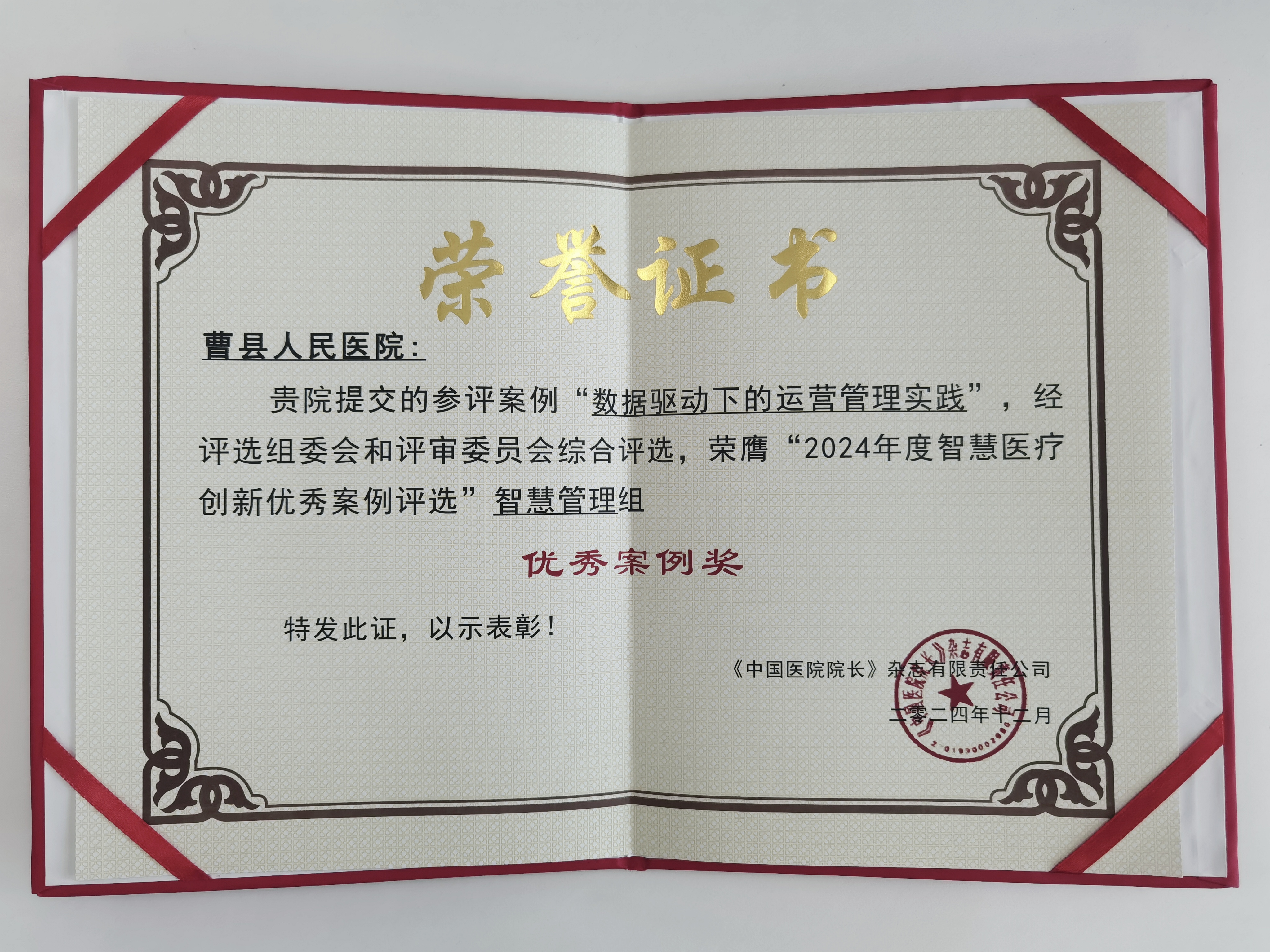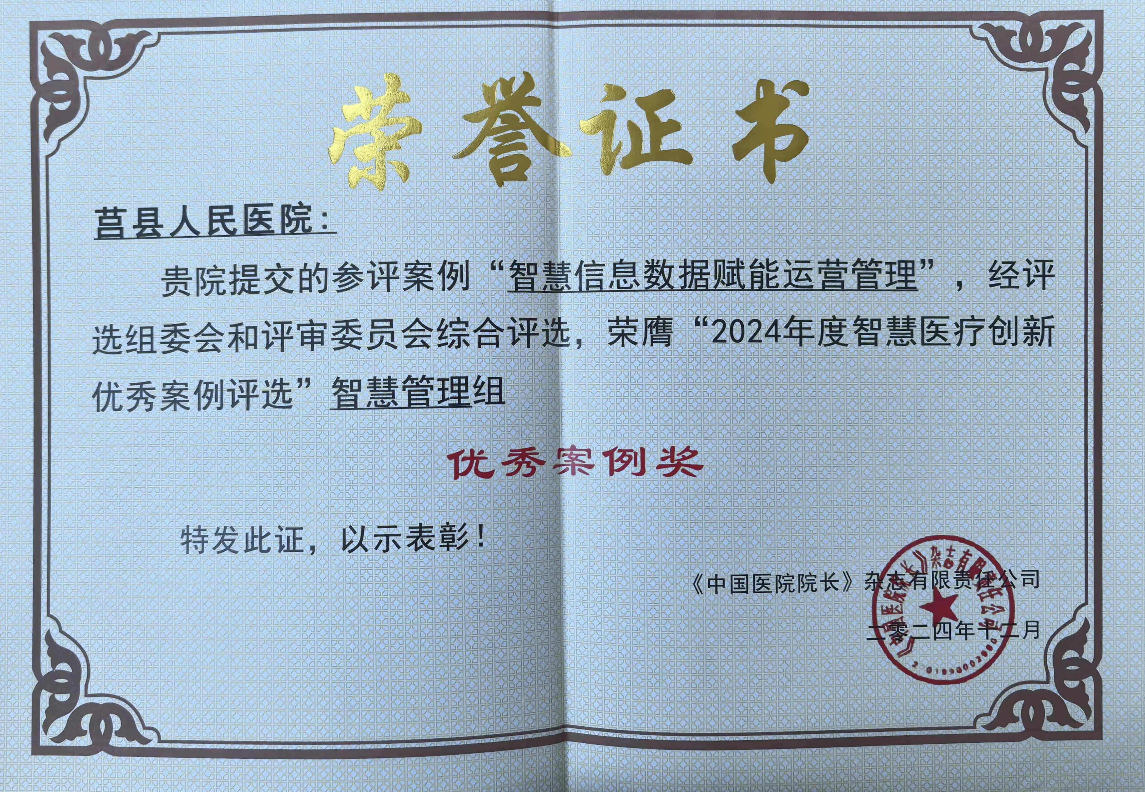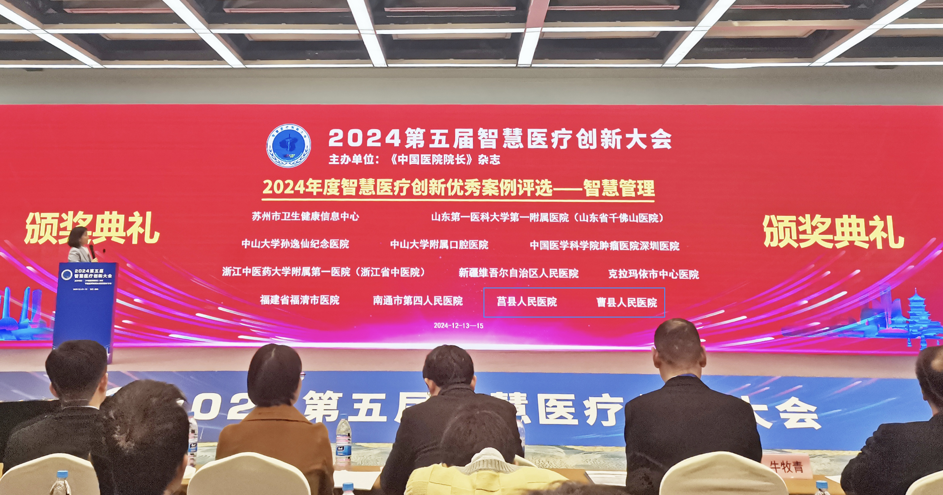 12月13日—15日,由《中国医院院长》杂志主办的2024第五届智慧医疗创新大会在杭州成功召开。众阳健康客户莒县人民医院参选的“智慧信息数据赋能运营管理”,以及曹县人民医院提报的“数据驱动下的运营管理实践”,经过多轮专家评审与严格筛选,成功荣获“2024年度智慧医疗创新优秀案例”(智慧管理组)奖项。