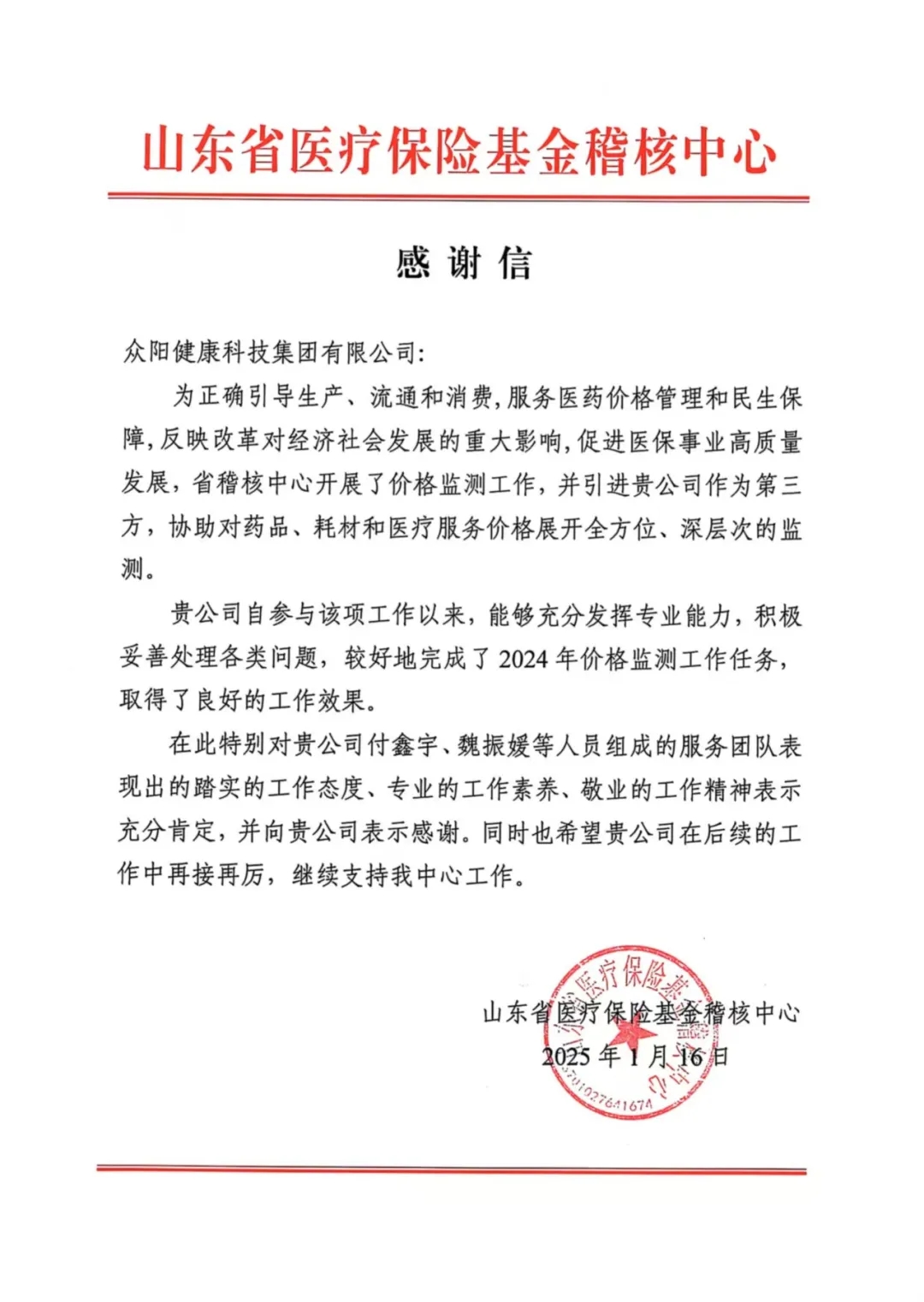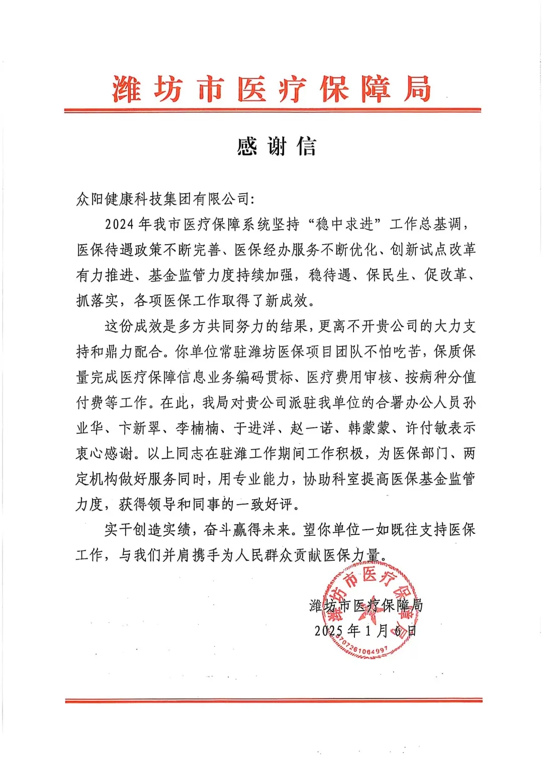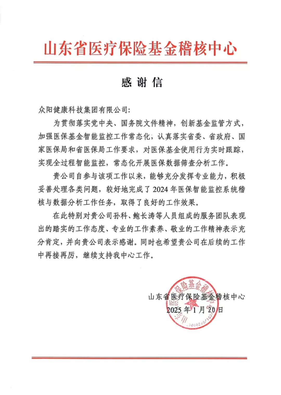 众阳健康接连收到山东省医疗保险基金稽核中心、聊城市医疗保障局以及潍坊市医疗保障局发来的多封感谢信。信中,各地医保管理机构高度认可并赞扬了众阳健康以科技创新推动医保事业发展所取得的显著成果。
