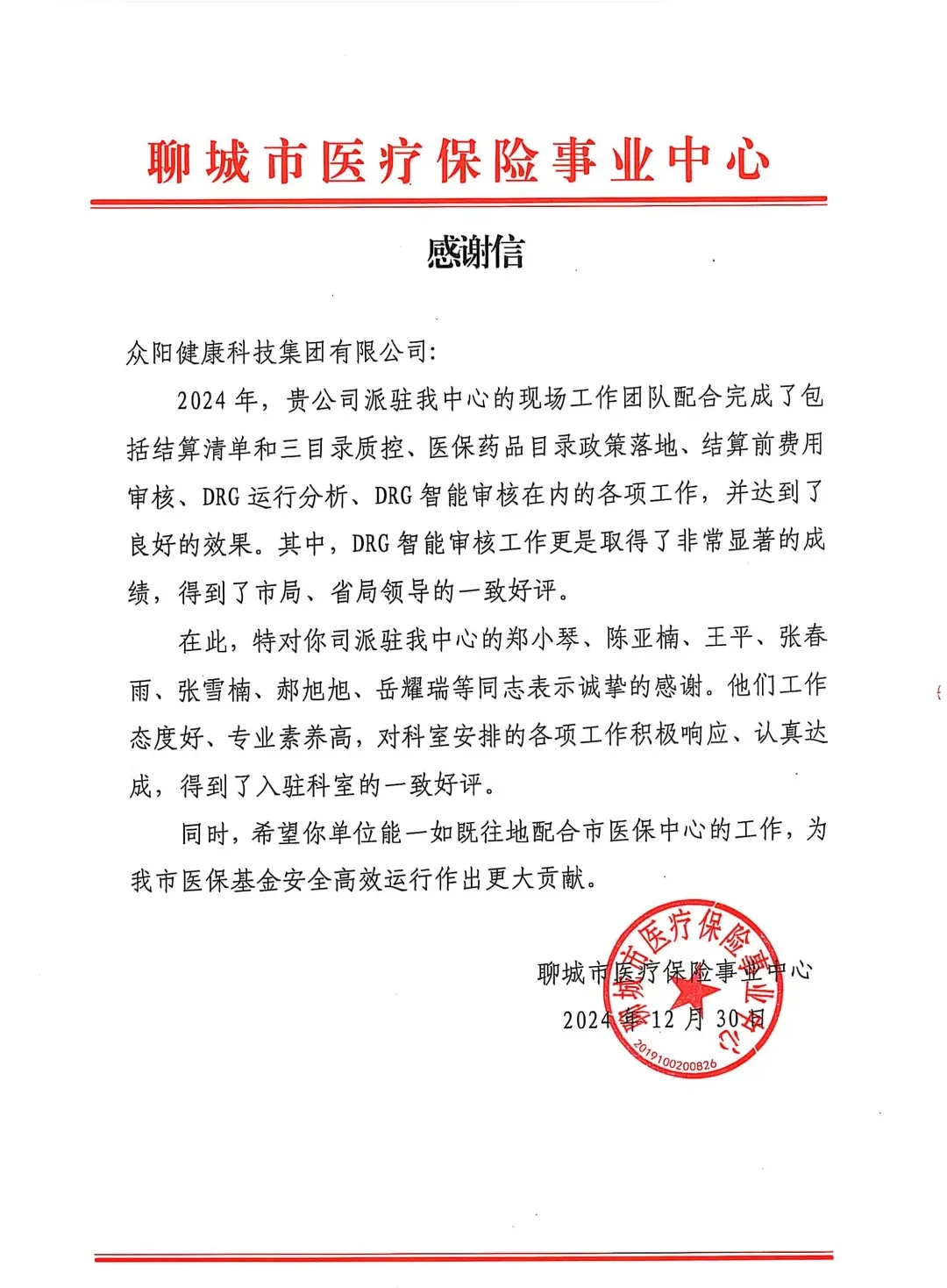 众阳健康全力支持聊城市医疗保障局的工作,通过参加聊城市医疗机构的省飞行检查、市本级医疗机构检查以及全市范围内的交叉检查等任务,共发现医疗机构等100多项违规行为,有效打击了医保基金的违规违法使用行为,切实保障了医保基金的安全。