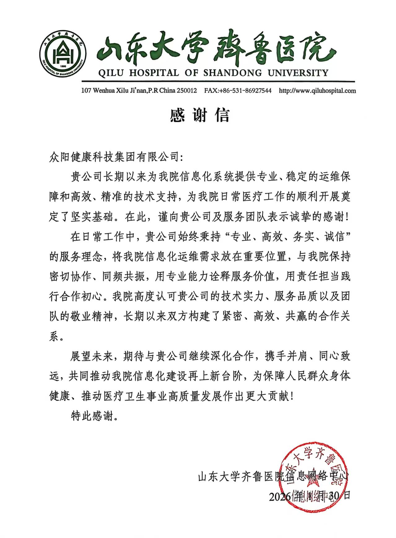 近日,众阳健康收到来自山东大学齐鲁医院的一封感谢信。字里行间,饱含着院方对众阳健康专业能力与服务品质的高度认可与诚挚谢意。这不仅是一份温暖的鼓励,更是医企携手、共赴使命的生动见证。