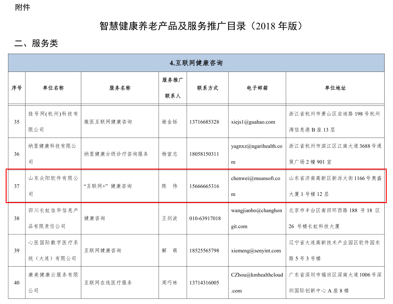 为贯彻落实《智慧健康养老产业发展行动计划(2017-2020年)》,促进智慧健康养老优秀产品和服务推广应用,为相关部门、机构和企业采购选型提供参考,经各地主管部门推荐、专家评审和网上公示,确定了《智慧健康养老产品及服务推广目录(2018年版)》(以下简称《目录》),其中众阳健康“互联网+”健康咨询入选。