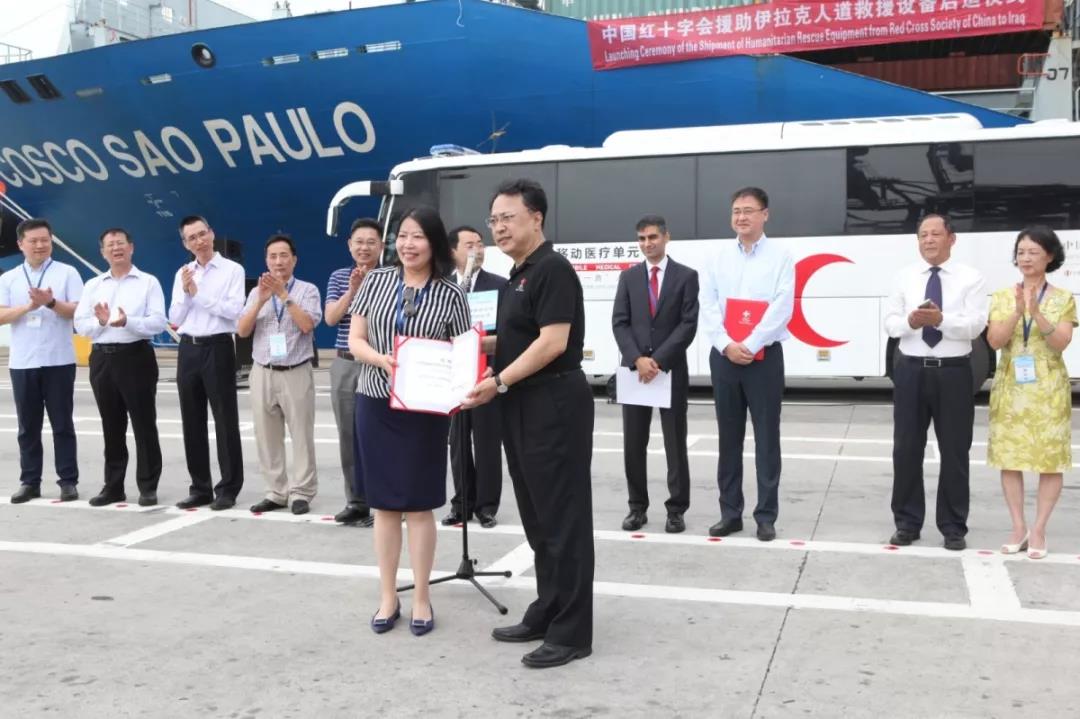 9月28日上午,中国红十字会援助伊拉克人道救援设备在深圳蛇口码头启运。中国红十字基金会理事长郭长江,伊拉克驻华使馆代表穆罕穆德·阿萨德·纳吉等出席本次活动。