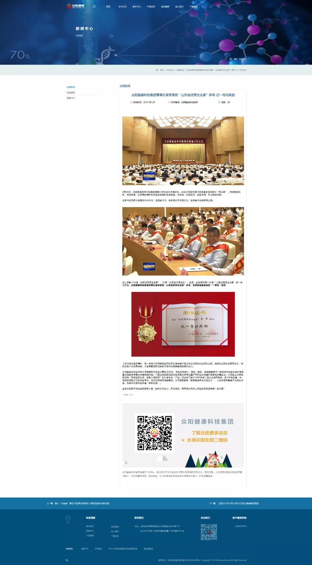 为适应公司发展的需要,树立公司的良好形象,满足用户(客户)通过网络了解公司产品、了解公司的服务,经过近两个多月的筹备,在2019年9月20日众阳健康官网改版上线完成。
