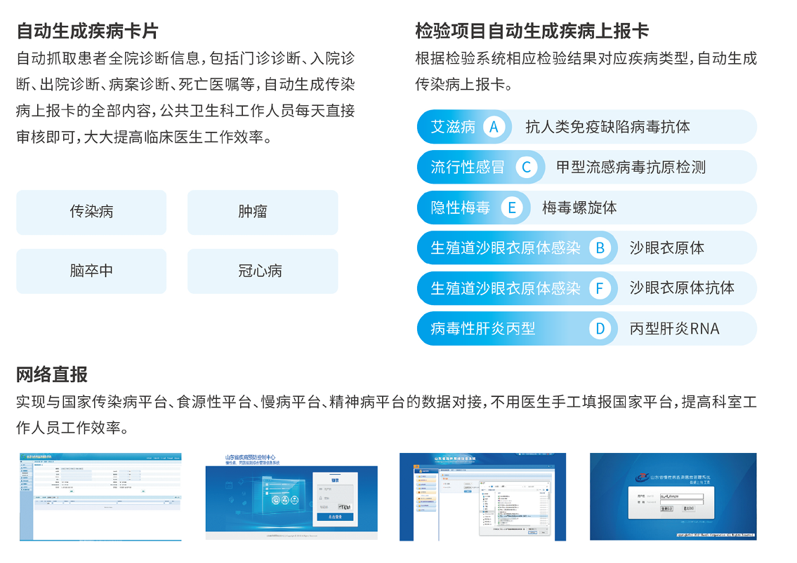 众阳云公共卫生上报系统改变医院公共卫生管理工作中手工上报、统计、查询处理方法,实现实时监控、在线监测、及时报卡、漏报提示、智能处理、自动统计等功能,为医院精细化和实时化管理提供帮助,降低临床科室上报工作量、提高工作效率、有力保障医疗安全。