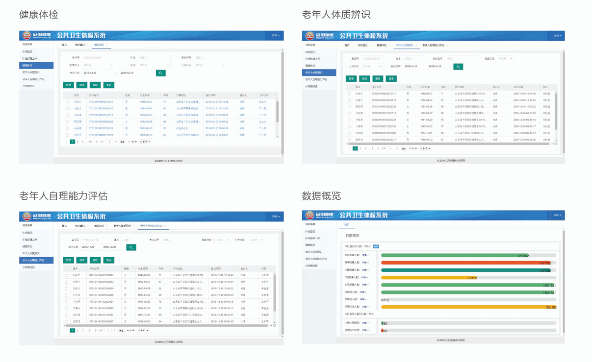 公共卫生体检系统辅助基层医疗人员完成公共卫生服务规范中的老年人体检服务,更好的对辖区内常住居民(居住半年以上的户籍及非户籍居民)进行体检。服务项目包括:血常规、尿常规、肝功、肾功、生化、心电、彩超检查、综合报告以及生化拓展检测项目、自理能力评估、中医体质辨识等。